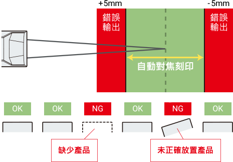 搭載3軸控制並內建CAMERA,無需外部機器即可實現自動對焦刻印。即使工件的高度改變也能追蹤,可以保持刻印品質。如果超過使用者設定的閾值,它還能執行錯誤輸出。一旦掌握工件缺少或翹起,不只能防止刻印不良,連後製程的問題也能防患於未然。
