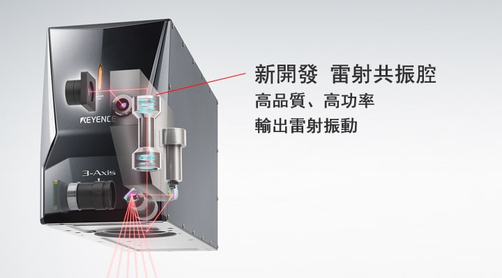 融合 YVO4 雷射與光纖雷射的技術。配備了兼具兩者優點,對雷射刻印機來說極為理想的共振腔。 這是只有持續開發固態雷射、光纖雷射二者的 KEYENCE 獨創技術。