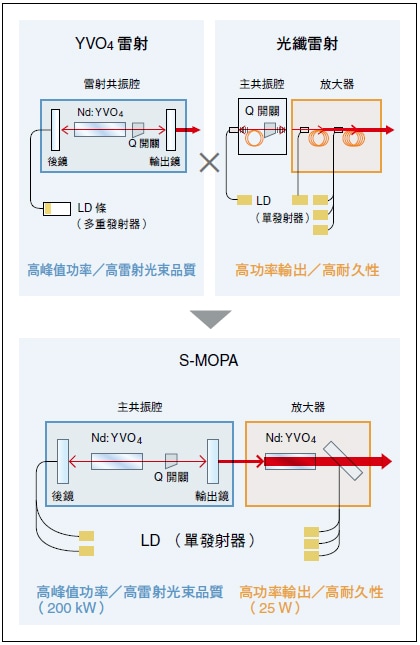 YVO4 雷射共振腔的高品質雷射光束維持不變,再加入光纖雷射所使用之放大器技術,達成高功率輸出的目標。光源之 LD(雷射二極體)採用高散熱的單發射器,實現高耐久性的目標。