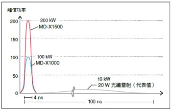 MD-X1500 系列的峰值功率為 200 kW,為傳統 YVO4 雷射的 2 倍。高功率輸出的同時,使用最短脈衝寬度 4 ns 的短脈衝雷射,將目標受熱損傷的程度降至最低。也最適合在樹脂上進行變色刻印等與需要極力避免熱影響的用途。