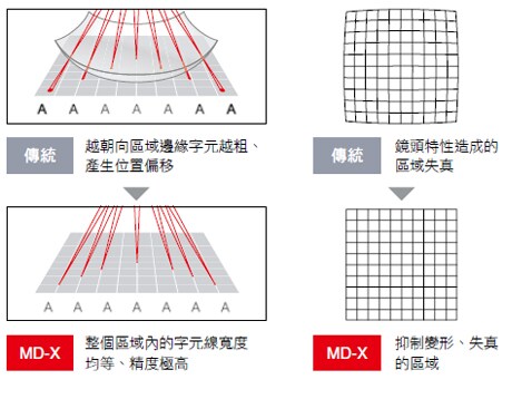 可在 330 mm x 330 mm 的大範圍內高精度刻印。 保有比傳統產品大 1.2 倍的大刻印範圍。簡化輸送製程不只可降低成本,還因減少輸送時間,有 助於提高生產力。此外,透過 3 軸控制,可消除 因傳統fθ 鏡頭特性而造成的區域變形、失真、 光點不均。即使是區域邊緣,也能達到焦點準確高精度的刻印、加工。