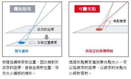 不想刻深下去時,有效的做法是故意讓焦點偏移。 物理性偏移安裝位置進行散焦,會造成座標或字元大小偏差,非常難以調整。可變光點功能可以僅調整光點大小(對焦),安裝位置維持不變。可依照設定的座標、大小進行刻印或加工。