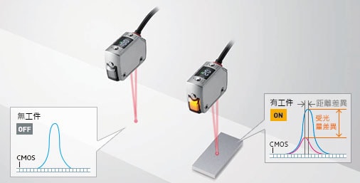 使用三角測量法,接收器有多個受光元件組成的CMOS視覺感測器。隨著和工件之間的距離改變,CMOS視覺感測器上的接收光波形高峰位置也會改變,藉此算出到工件的距離。