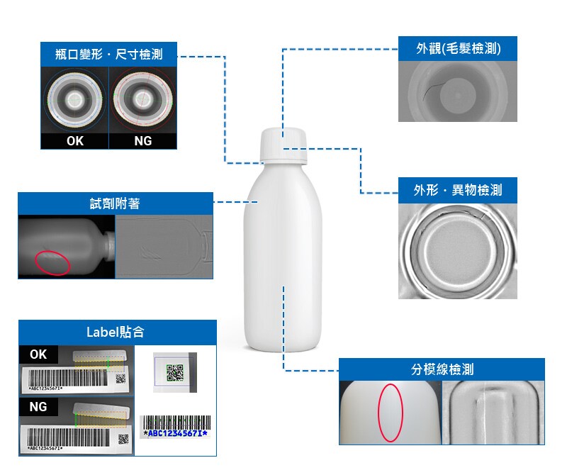 對於存放各式各樣藥品的塑膠瓶來說,一般需要非常高標準的品質管理。就算是注塑成型的樹脂瓶也不例外,對於在FA現場有著眾多應用案例的基恩斯視覺系統來說,就算是這個領域我們也依舊活耀在其中。
