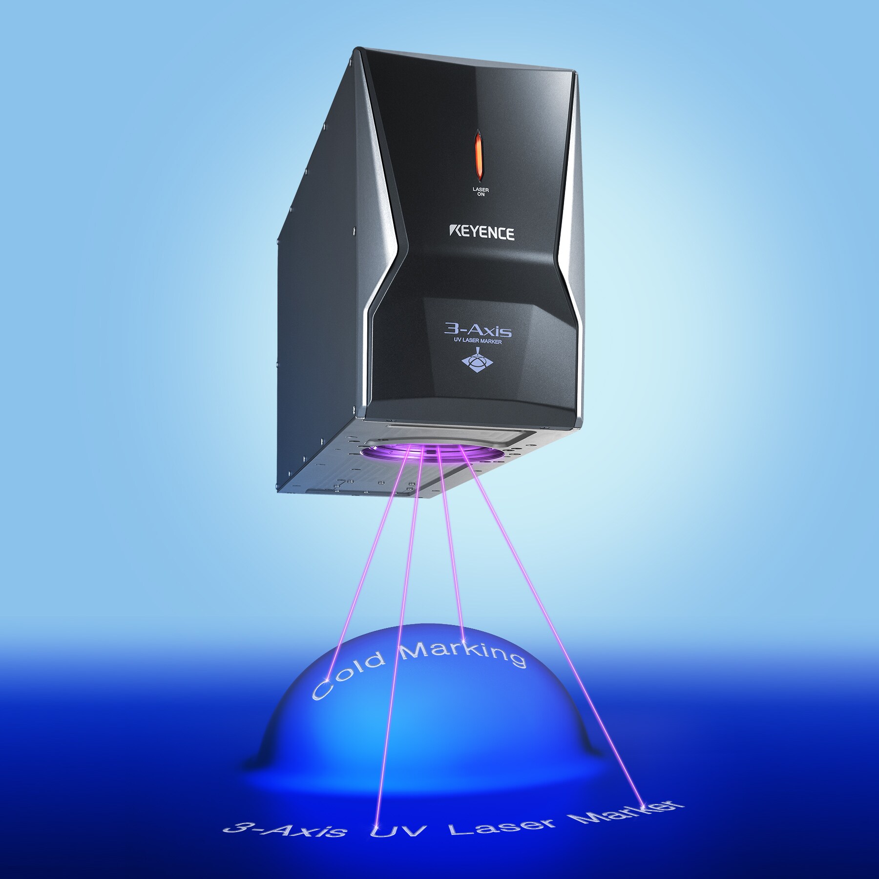 UV雷射(波長 355 nm)具有對各類材料極高吸收率的特性。針對以往使用基本波長(1,064 nm)的雷射刻印機,容易產生熱影響或在某些材質上辨識度不佳的情況,UV雷射刻印機能實現高顯色、無損傷的精細刻印與加工。此外,搭配刻印頭內建的測距感測器與多功能CAMERA,可自動補正與目標物之間的距離偏移及搬運過程中的位置偏移。並且透過雷射輸出監控與窗口髒污檢測,預防刻印不良,實現穩定運行。