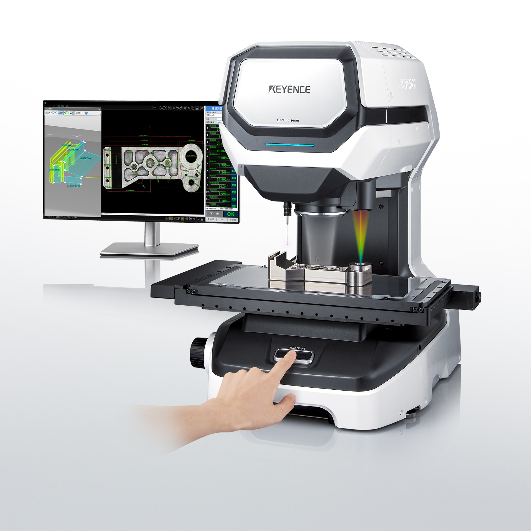 只需將目標物置於載物台上並按下按鈕的簡單操作,即可實現±0.1 µm的高精度量測。配備3種量測方式,即高精度影像量測、利用彩色雷射的非接觸式高度量測、利用三次元接觸式探測器的接觸量測。大幅縮短複雜的量測目標物的尺寸量測時間,實現不含有量測者誤差的正確量測。