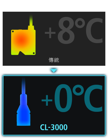 感測頭內部沒有電子元件,只由鏡頭組成。因此不會受到發熱 及干擾所導致的變形、光軸偏移因素影響量測值。