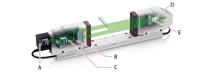 綠色LED光以均勻的平行光束發射。當目標物遮斷此光束時,會在受光元件上形成陰影,測量此陰影即可準確反映目標物的尺寸。