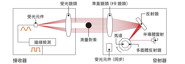 雷射光照射到旋轉的多邊形反射鏡上,該鏡以恆定速度將光束掃描至感測器的測量範圍。像外徑這類的測量,是通過計算光線被接收器遮擋的時間來確定的。