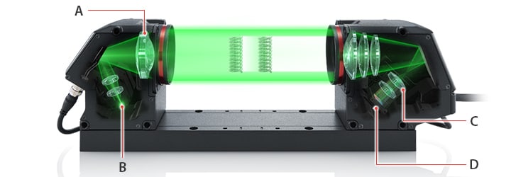 發射器以綠色LED發出平行光,將陰影投射到接收器的CMOS感測器上。測量則利用所捕捉到的影像進行。TM-X5000 系列在發射器和接收器均配備遠心鏡頭,確保穩定且高精度的測量。