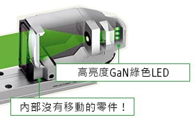 高強度綠色LED比傳統LED光源壽命更長,同時提供高亮度且均勻分布的照明。