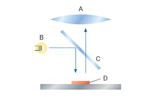 A:鏡頭 B:光源 C:半反射鏡 D:目標物