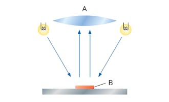 同軸照明的光走向與鏡頭的光學路徑一致。同軸落射照明是透過半反射鏡,讓照射到目標物的光軸與鏡頭光軸平行。此照明方法在觀察鏡面加工的金屬表面或光滑的塑膠表面,以及類似半導體晶圓的鏡面反射目標物時使用,或者在觀察目標物的結構和表面光澤的差異,而非形狀時使用。