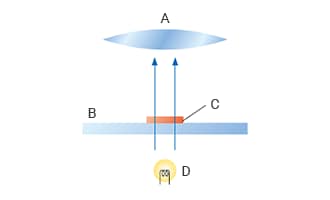 A:鏡頭 B:玻璃板 C:目標物 D:光源