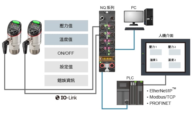 透過測溫功能中的環境溫度抑制(ATS)功能實現高精度的溫度量測。同時監視壓力與溫度,除了可以從本體的LED一眼辨識溫度狀態以外,還可透過IO-Link將感測器的資料傳送到PLC及PC等,早期發現異常跡象,即可輕鬆實現徵兆管理及遠端監控。