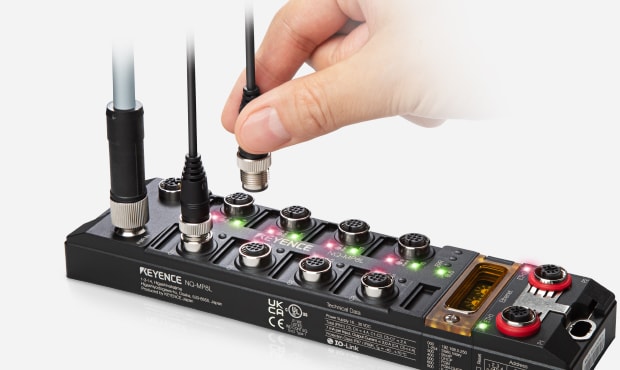 NQ 系列網路通訊模組做為IO-Link主站,大幅簡化感測器的連接方式。透過M12連接器輕鬆連接支援IO-Link設備,大幅削減啟動時間。此外,NQ Sensor Monitor(專用軟體)連接KEYENCE產品後會自動辨識,誰都能輕鬆進行感測器的參數設定等操作。當然,也支援所有支援IO-Link的設備。