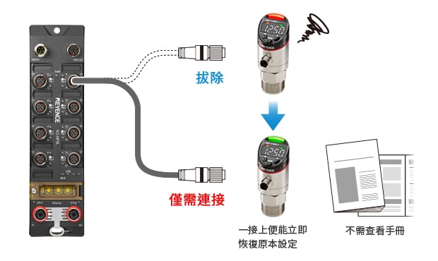 NQ 系列本機會備份感測器的個別設定和各種參數,即使感測器損壞,只要更換新的感測器即可恢復。無須再次設定感測器。