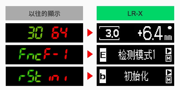 以往的7 段顯示器只能顯示簡單的文字,沒有操作手冊便難以使用。LR-X 系列可讓人員讀到顯示內容,從設定到維護,任何人都能直覺式操作。