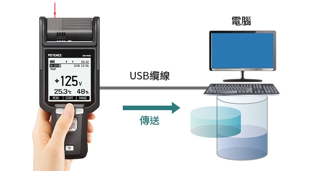 量測到的數據可記錄在主體的內部緩衝記憶體,最多記憶100組數據。記錄的數據可用USB纜線傳送至電腦,以CSV數據儲存。