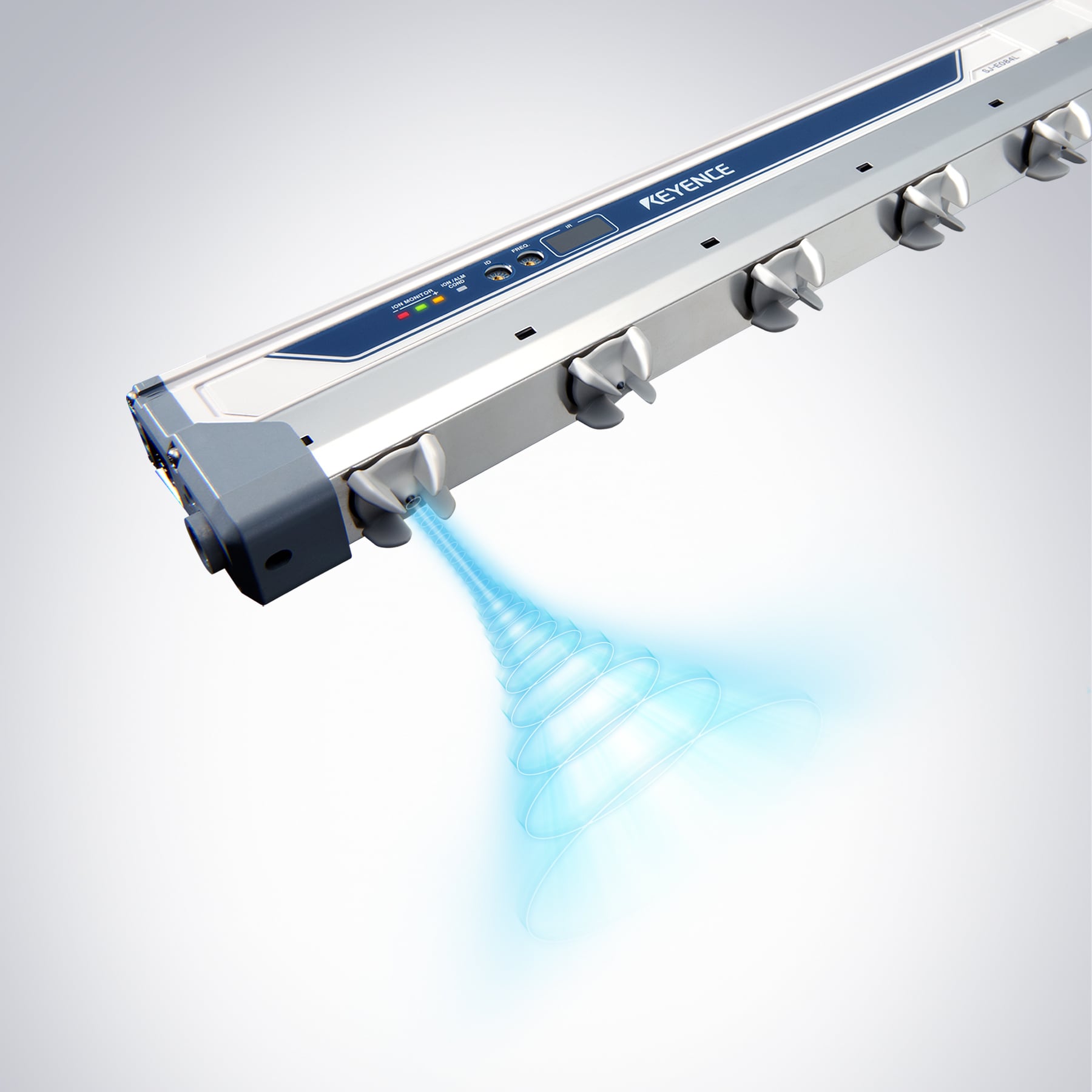 KEYENCE 採用消除器史上首度開發的Supersonic 結構, 讓離子超越音速,以極小流量達到靜電消除速度世界第一。