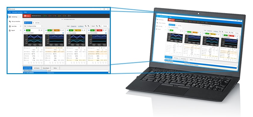 不必前往現場,即可遠端確認最多100台的狀態。還可在必要時變更設定或輸出至Excel。