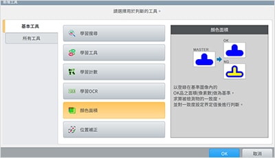 AI 會根據已登錄的 OK 品和 NG 品,由顏色、亮度、面積、形狀、邊緣等各種觀點,找出差異最大的部分,自動進行最佳檢測設定。只要登錄 OK 品和 NG 品,即可完成設定。