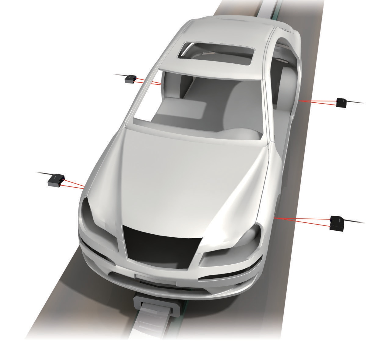 使用高速雷射位移感測器 LK-G3000 系列,可從 1 m 外的距離量測車體寬度或車門傾倒。利用 ABLE 功能可穩定量測,不易受表面狀態差異的影響。