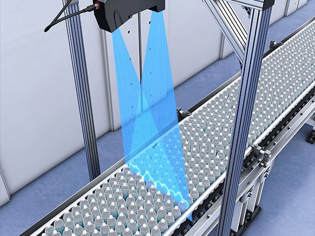 檢測飲料瓶的傾倒。裝箱前的飲料瓶可能在搬運中出現傾倒或偏移。萬一發生飲料瓶破裂、輸送帶堆疊等不良時,及早發現可以減少停機時間。