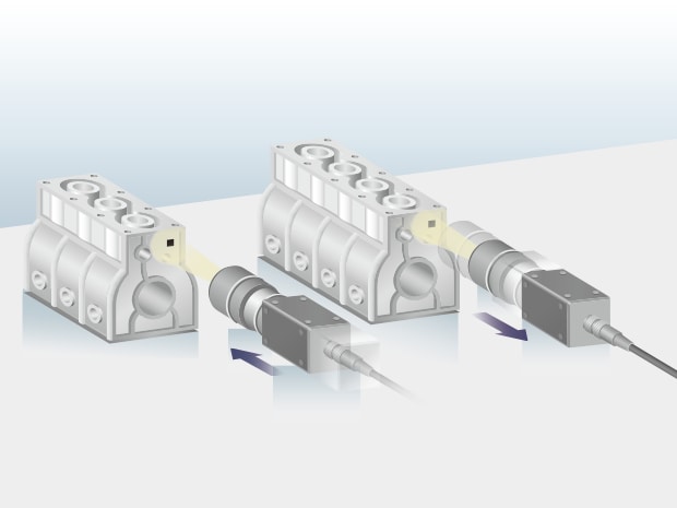 若使用 1 條生產線輸送不同尺寸的引擎,因條碼讀取距離會有所變動,故需進行變更作業。若使用具超景深讀取能力的 SR-2000,無論至目標物的距離為何皆可讀取,故可減少變更的工時。