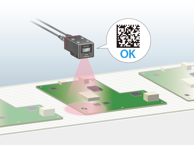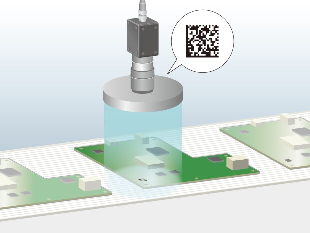 若經焊接處理後的印刷電路板上印有條碼,則會因光線反射產生光暈,所以需要安裝外部照明。搭載偏光濾鏡自動控制功能的 SR-2000 本體即可消除光暈,所以不需要安裝外部照明。