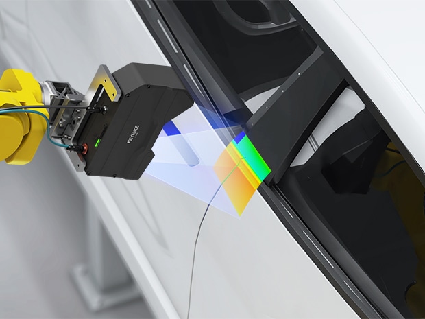 過去依賴截面形狀輪廓進行品質保證,而本系列的內建掃描機構能以面捕捉最大640×640 mm 的寬廣範圍。將感測頭搭載於機械手臂,可實現多部位的尺寸量測。