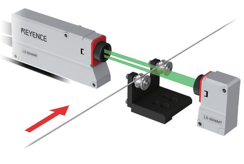搭載「極細模式」,穩定量測 ø10 µm 的極細線。與傳統機種相比,可量測更細的外徑或間隙。且 LS-9000 系列的發射器與接收器分離,因此在多條線材並排的製程中,能一面橫向移動1 台量測部,一面量測多條線材的外徑。