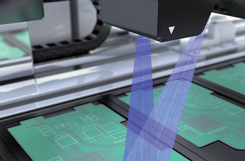 以往都是使用 1D 雷射位移計掃描後再進行量測。LJ-X 系列採用線性雷射,不必移動量測頭即可量測載具與印刷電路板間的段差。由於不須停止輸送就能量測,因此成功縮短了檢查時間。