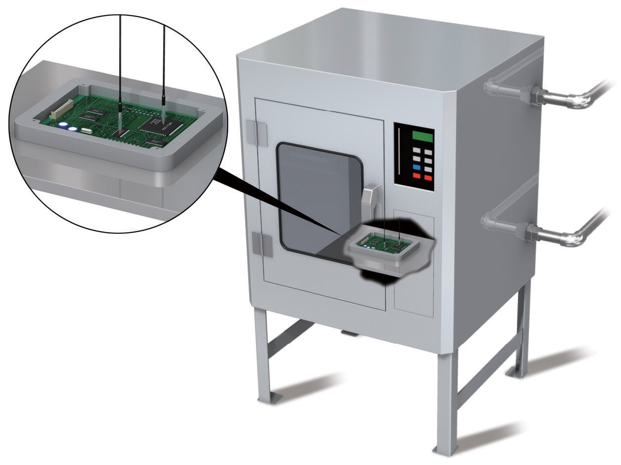 過去還沒有能在 100°C 以上環境使用的量測器,因此需要隔著視埠從外面進行量測。SI 系列可將量測頭放入高溫室中執行量測,連溫度飄移也不會發生,故可執行高精度的評估測試。