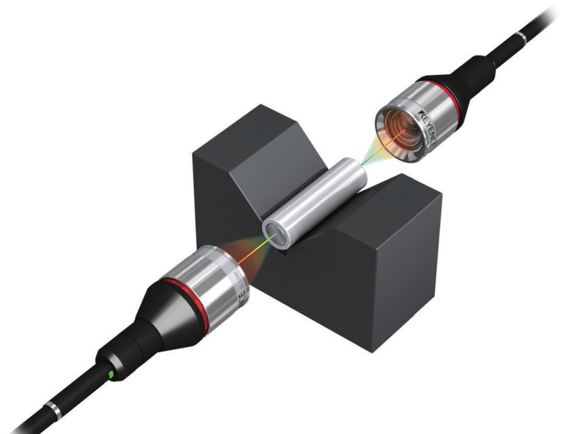 設置用2 個感測頭夾持目標物,來量測電池的全長。設置感測頭時使用專用固定夾具和光軸校正功能,誰都可輕鬆設置,可實現高精度量測。