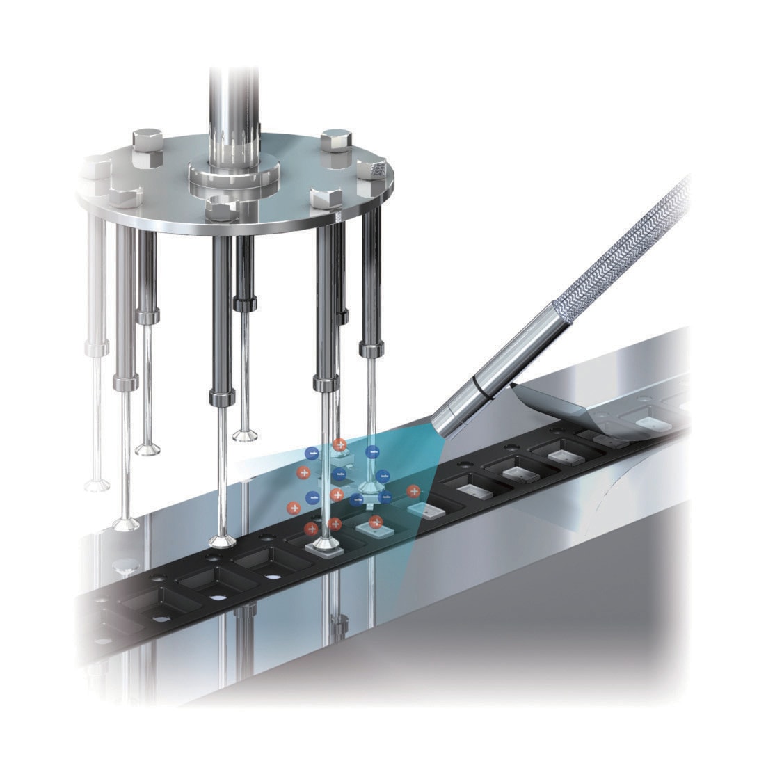 在測包機中,靜電會使 LED 晶片彈出或變更位置(翻轉、倒下),從而導致有缺陷的包裝。靜電消除器可以解決此類問題。