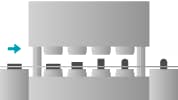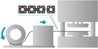 將各製程獨立型排列在一台沖壓機械內,沖壓機械有和沖壓本體同步的輸送機構,進行連續自動加工。
