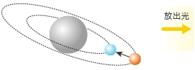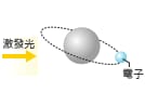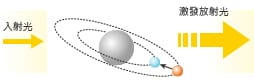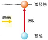光由外部射入,原子中的電子會吸收光,由能量最低的狀態=基態進入高能量狀態。能量高時電子就會由平常的軌道移動到外側的軌道。這種能量高漲的狀態就稱為『激發』。