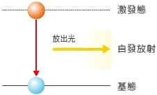 被激發的電子會視吸收的能量多寡,提高能階。能階提高後的電子經過一段緩和時間後,就會想回到穩定而釋放出能量,嘗試回到低能階狀態。此時會發射出和釋放的能量相同能量的光。這種現象稱為『自發放射』。