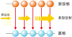 如下圖所示,高能量狀態電子存在,當和此電子的能量相同能量的光射入,就會釋放出能量、相位、前進方向完全相同的光。也就是說,出現射入時的一道光,射出時變成二道光的現象。這就稱為『激發放射』。
