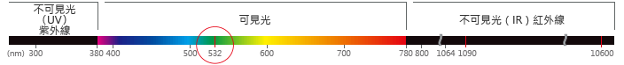 532 nm的波長是可視光領域的綠色光,因此也被稱為綠光雷射。將YAG或YVO4雷射生成的基本波長,透過單晶體氧化物(LBO:硼酸鋰)後轉換而成。