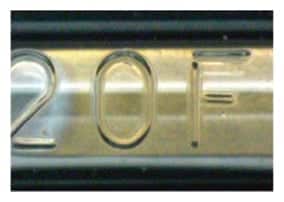 會產生細微龜裂的刻印。以低功率分數次重覆刻印,可得到更清晰的印字。