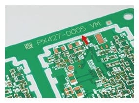 - 刻印時功率過高會產生黑色碳粒,因此印刷電路板必須以低功率刻印,這一點很重要。此外基本波長雷射會穿透電阻,可能影響圖案,因此CO2雷射最為適合。