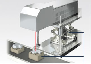 3軸雷射刻印機可在42 mm範圍內任意設定焦距。不需要刻印頭的上下機構,或視品種以工件用的承載治具對焦。有助於大幅減少安裝成本,縮短變更時間。