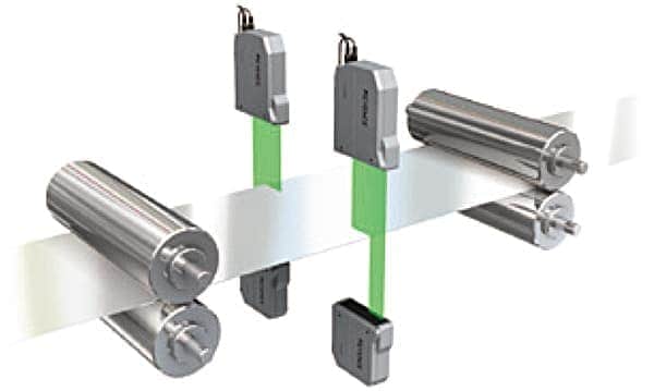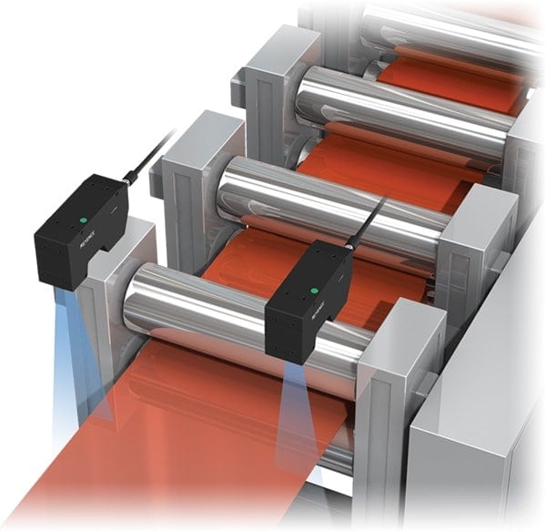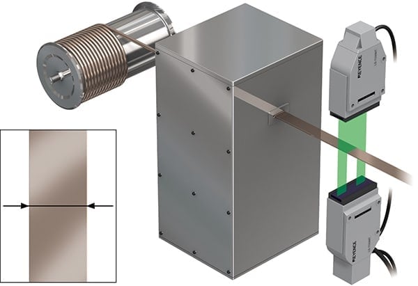類似鋼板的長條狀物體的寬度量測一般使用對照型測量儀,但是無法組裝到設備中時,2D雷射位移計是良好的選擇。與對照型測量儀相比,量測精度有所下降,但只需設置在目標物的正上方即可簡單安裝。