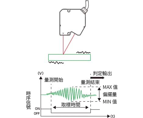 例如,振動頻率為1 kHz(=1秒內1000次往返移動)時,如果使用取樣速度1 kHz的位移計量測,則1個振動週期內只能取樣1點,因此無法正確捕捉振動波形,也無法獲得正確的振幅。如果使用取樣速度100 kHz的位移計量測,則1個振動週期內可標繪100點,可以正確捕捉振動波形,也能夠獲得正確的振幅值。