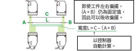寬度較寬時,使用2台感測頭,檢測左右的邊緣位置,量測寬度。