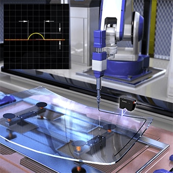 透過在點膠機械手臂實施的玻璃上的聚氨酯泡沫自動塗佈中導入「LJ-X8000系列」,可以跟隨裝置在塗佈後立即進行全周檢查。透過極細間距的超高速取樣檢查剛塗佈完的截面形狀,從而監視塗佈不良。