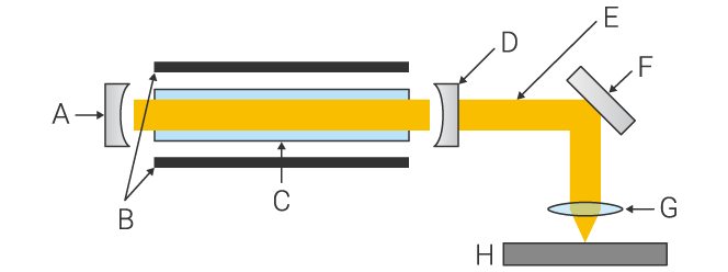 CO2與固體雷射相比,轉換效率高,可實現大輸出的連續振盪(CW:Continuous Wave)。激發源為放電式,波長有10.6 μm和9.4 μm,焊接中使用10.6 μm。不僅可以焊接金屬,還支援樹脂類等的焊接,因此在廣泛的領域中普及。