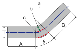 可以通過求得從彎曲R到中性軸的距離來近似模擬穩定彎曲加工所需的彎曲展開尺寸。由於直線部分 A 和 B 不會因彎曲而發生變化,因此按原樣使用這些數值。